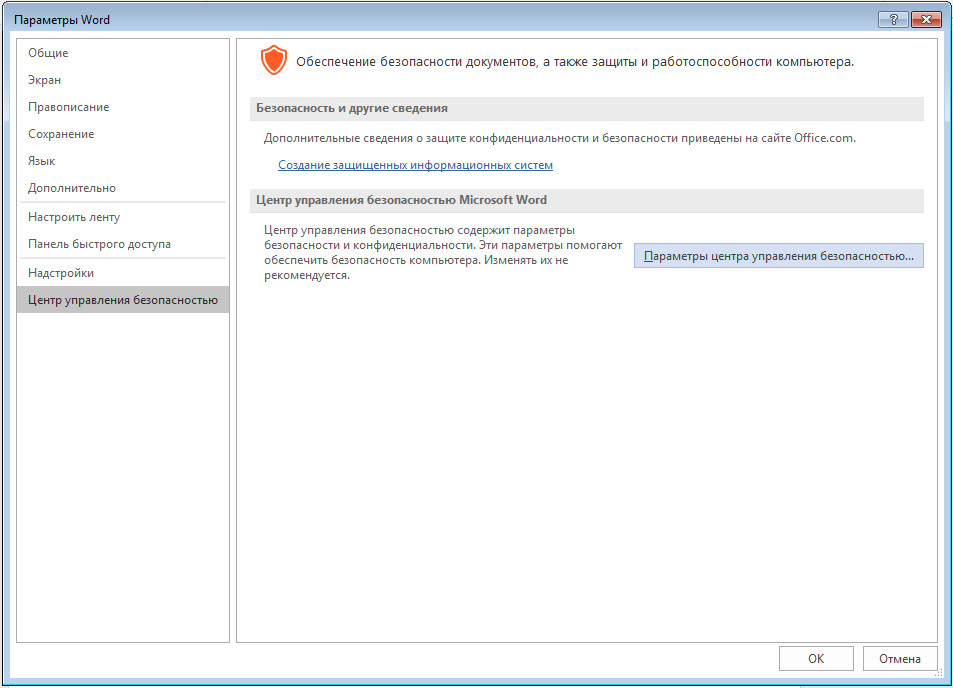 В MS Word в разделе меню Файл-Параметры откройте раздел Центр управления безопасностью.