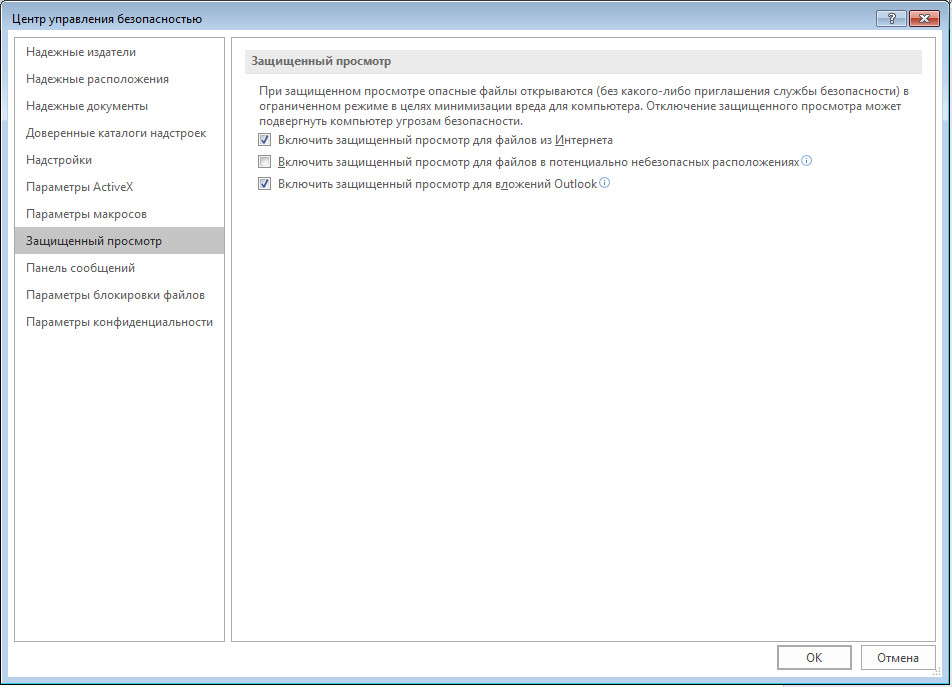 В открывшемся окне откройте раздел "Защищенный просмотр".