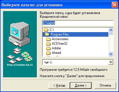 Выберите нужную папку для инсталляции (например C:\urprof ) через дерево каталогов, либо укажите в текстовой строке. По умолчанию для каждой программы папка своя.