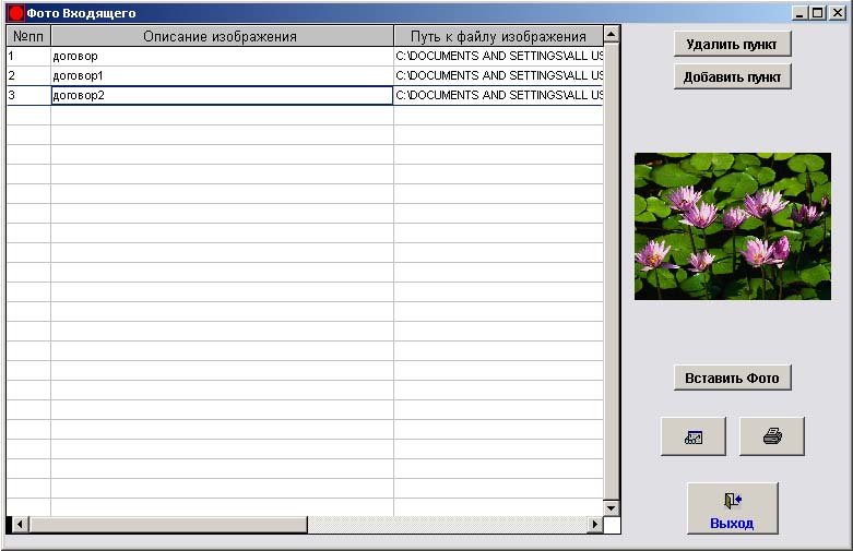 | 6. Фото входящего: позволяет вставлять в базу фотографию входящего документа. Нажимаете на кнопку фото входящего. Открывается окно "Фото входящего" (рис. 1.2.6). |