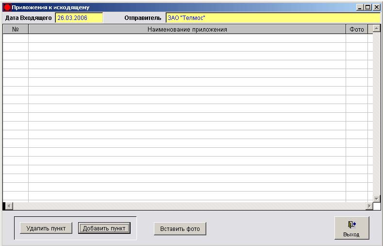 - Приложения - позволяет создать и просмотреть приложение к входящему документу. Если выбрать документ и нажать на кнопку Приложения , то откроется окно "Приложения к исходящему " (рис. 1.3.10).