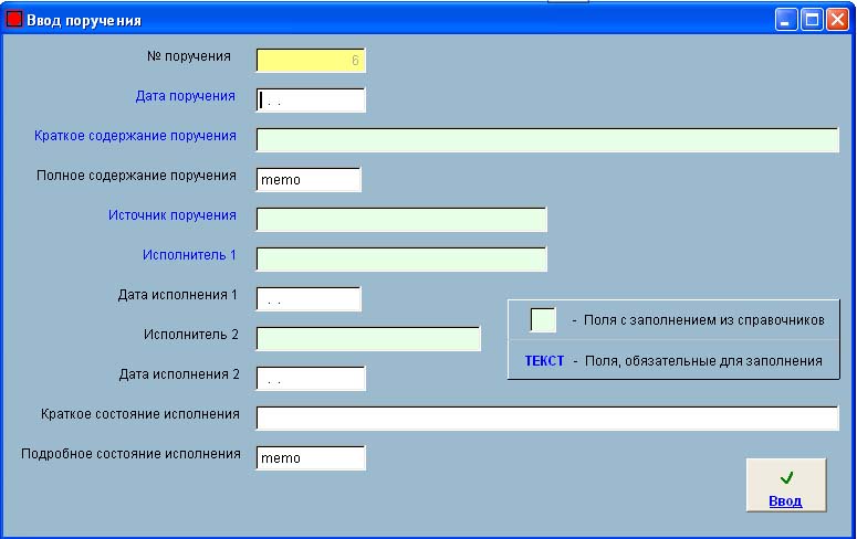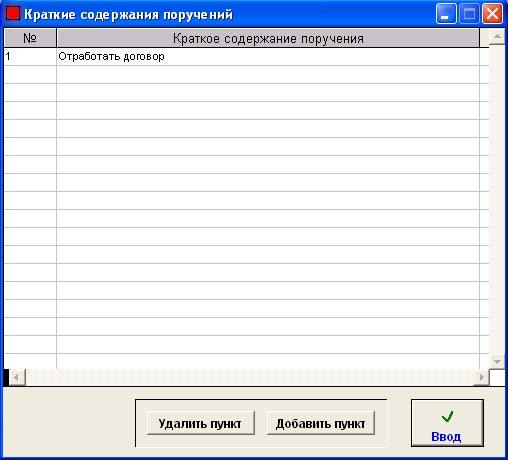 Для добавления нового поручения нажмите кнопку "Добавить пункт". Откроется окно "Ввод поручения" (рис. 2.2.2).