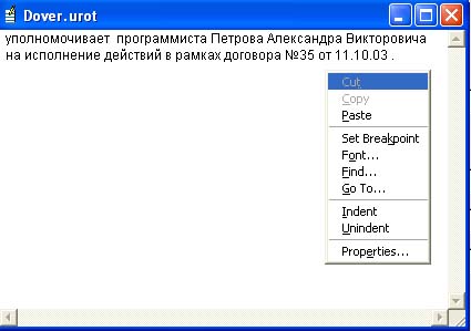| 5. Содержание доверенности: при двойном нажатии на белое "Memo-поле" поле откроется окно, где находится шаблон содержания доверенности (рис. 3.2.8). Шаблон можно сформировать из любого поля через буфер Windows. Из любой программы (блокнот, word и т.д.) копируется текст документа. Нажав на правую кнопку мыши в окне шаблона, выбираете пункт меню Paste. Далее шаблон надо подредактировать. Пробелами выставить отступы ( Tab не использовать), где перевод строки - добавить Enter. Если поле заполнено , то "Memo" с большой буквы "M". Если поле пустое, то "memo" с маленькой "m". Следует знать , что каждой доверенности соответствует своё "Memo-поле". |