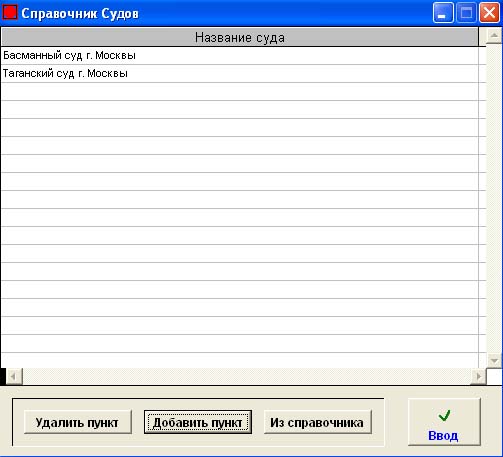 | В окне "Справочник Судов" подводите курсор мыши к нужному вам варианту и нажимаете на него. Затем нажимаете на кнопку Ввод (рис. 4.2.16). |