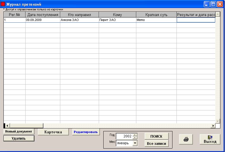 - Удалить - удаление старой претензии. Выбираете любую претензию и нажимаете на кнопку Удалить. Программа спросит вас "Удалить эту запись?". Вы нажимаете "Да".