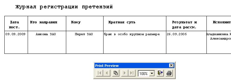 - позволяет распечатать все претензии. Если нажать на кнопку Печать, то откроется "Журнал регистрации претензий " и "Print Preview" (рис. 6.1.6).