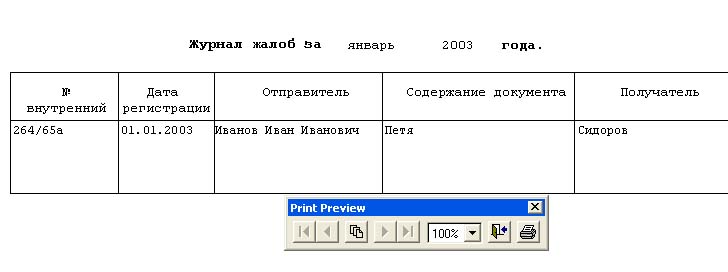 - позволяет распечатать жалобы за выбранный вами месяц и год. Если нажать на кнопку , то откроется "Журнал жалоб " за выбранный вами месяц и год и "Print Preview" (рис. 7.1.10).