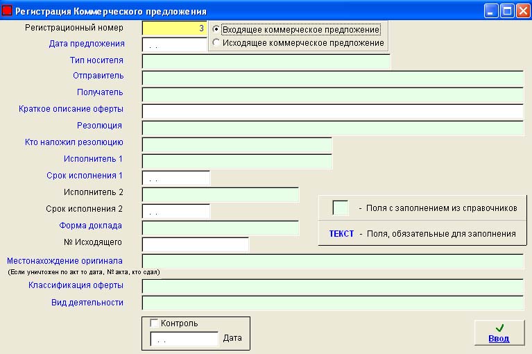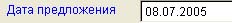 | 2. Дата предложения: cтавите курсор в крайне левое положение белого поля "дата предложения ", и начинаете вводить дату, не обращая внимание на точки. После заполнения этого поля, курсор автоматически переходит на следующее поле. В том случае, если вы ввели неправильно дату (13-й месяц, 32-й день и т.д.), то в правом верхнем углу экрана появится сообщение Invalid Date . В итоге получается так, как показано на рис. 8.2.4. |