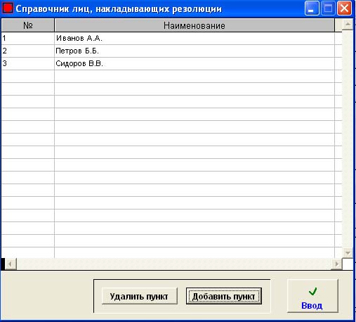 | 8. Кто наложил резолюцию: при нажатии на салатовое поле открывается окно "Справочник лиц, накладывающих резолюцию" (рис. 8.2.14). |
