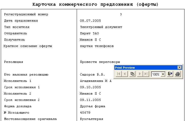 - Печать карточки - позволяет распечатать карточку коммерческого предложения. Если нажать на кнопку Печать карточки, то откроется "Карточка коммерческого предложения" и "Print Preview" (рис. 8.2.31).