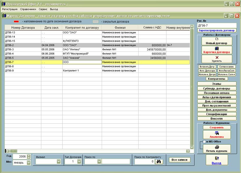 | При выборе пункта меню "Регистрация" - "Журнал договоров" загрузится окно "Журнал договоров" (рис. 9.2.1). |