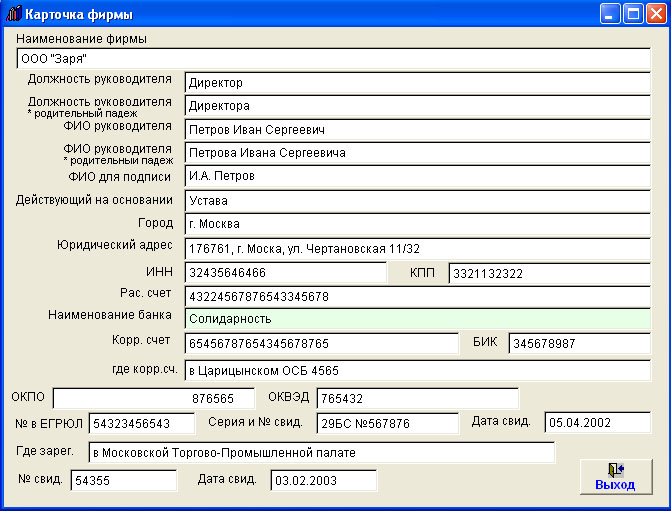 | Заполнить карточку фирмы не представляет большой сложности. Единственная особенность - заполнение третьего и пятого белого поля в родительном падеже. Карточка филиала заполняется аналогично. |
