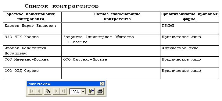 Печать Журнала: позволяет распечатать журнал контрагентов. Если нажать на кнопку Печать журнала, то откроется "Список контрагентов " и "Print Preview" (рис. 1.1.5).