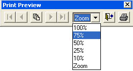 В окошке "Print Preview" можно изменить масштаб отчёта. Нажмите на значок и выберете масштаб (рис. 1.1.6).