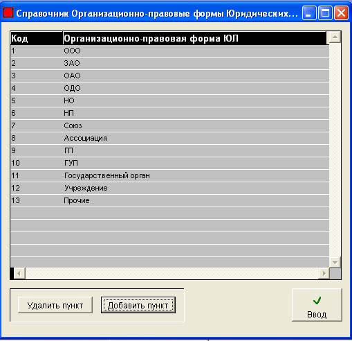 | Если нажать на салатовое поле под заголовком "Орг.-правовая форма ЮЛ", то откроется окно "Справочник Организационно-правовые формы Юридических лиц" (рис. 1.2.6). Здесь вы выбираете организационно-правовую форму и нажимаете кнопку Ввод. Также здесь можно добавить новый пункт и удалить старый. |