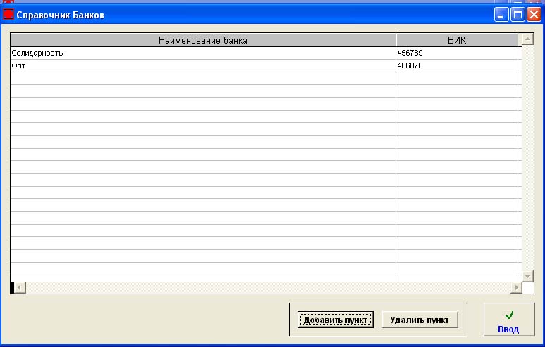 | Если нажать на салатовое поле под заголовком "Наименование банка ", то откроется окно "Справочник Банков " (рис. 1.2.7). Здесь вы выбираете банк и нажимаете кнопку Ввод. Также здесь можно добавить новый пункт и удалить старый. При выборе банка БИК заполняется автоматически. |