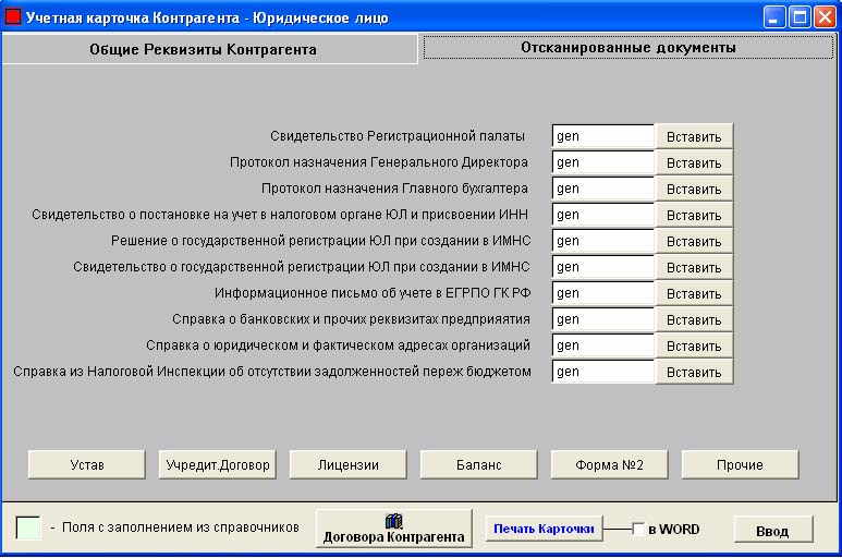 | Здесь вы можете просмотреть договора контрагентов и распечатать карточки как в программе, так и в MS Word. |