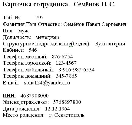 Если нажать на белый квадратик (рис. 2.2.9),то внутри него появится галочка. Тогда , если нажать на кнопку , то все данные карточки сотрудников передадутся в MS Word ( рис. 2.2.10). |
