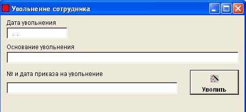 | Заполняете эту карточку и нажимаете кнопку Уволить. Если заполнены не все поля , то программа выдаёт предупреждение. |