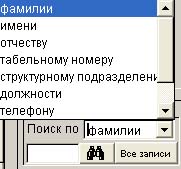 | Расмотрим систему поиска окна "Журнал сотрудников ". Здесь предоставляется возможность поиска по следующим реквизитам сотрудника: |