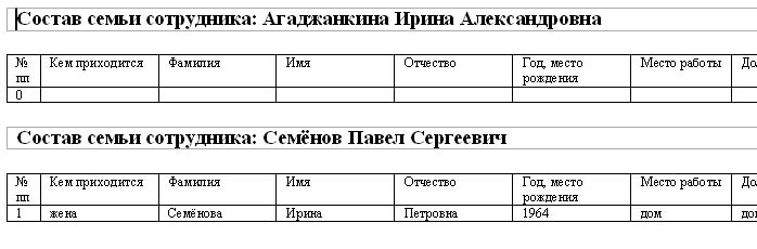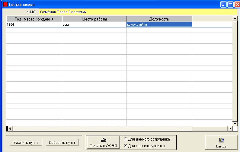 | В этом окне есть возможность добавить новый пункт и удалить старый. Если нажать на белый кружок под заголовком "для данного сотрудника", то внутри него появится точка. Затем если нажать на кнопку Печать в Word , то MS Word передадутся данные на данного сотрудника (рис. 2.2.12). Если нажать на белый кружок под заголовком "для всех сотрудников" и проделать аналогичные действия, то в MS Word передадутся данные на всех сотрудников (рис. 2.2.13). |