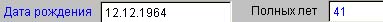 - Дата рождения: cтавите курсор в крайне левое положение белого поля "дата рождения ", и начинаете вводить дату, не обращая внимание на точки. После заполнения этого поля, курсор автоматически переходит на следующее поле. В том случае, если вы ввели неправильно дату (13-й месяц, 32-й день и т.д.), то в правом верхнем углу экрана появится сообщение Invalid Date . В итоге получается так, как показано на рис. 2.2.6. Рядом с полем "дата рождения " находится поле "Полных лет". Оно заполняется программой автоматически. По умолчанию в этом поле стои 1. После того, как вы ввели дату рождения и ввели карточку сотрудника, то в этом поле появляется количество полных лет.