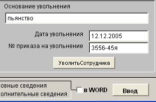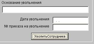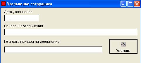 | Для увольнения сотрудника вы должны заполнить все поля, представленные на рис. 2.2.7 (рис. 2.2.8). После этого нажимаете кнопку Ввод. |