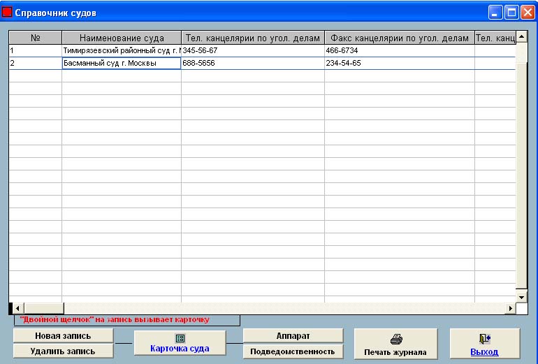 - Удалить запись - удаление старого суда. Выбираете любой суд и нажимаете на кнопку Удалить запись. Программа спросит вас "Удалить эту запись?". Вы нажимаете "Да".
