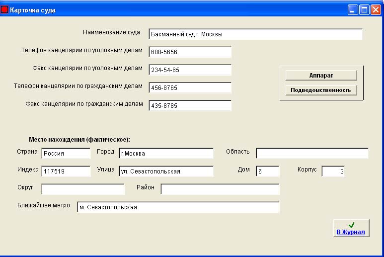 - Карточка суда -позволяет просмотреть и редактировать карточку суда. Если выбрать суд и нажать на кнопку Карточка суда , то откроется одноимённое окно (рис. 3.1.5).