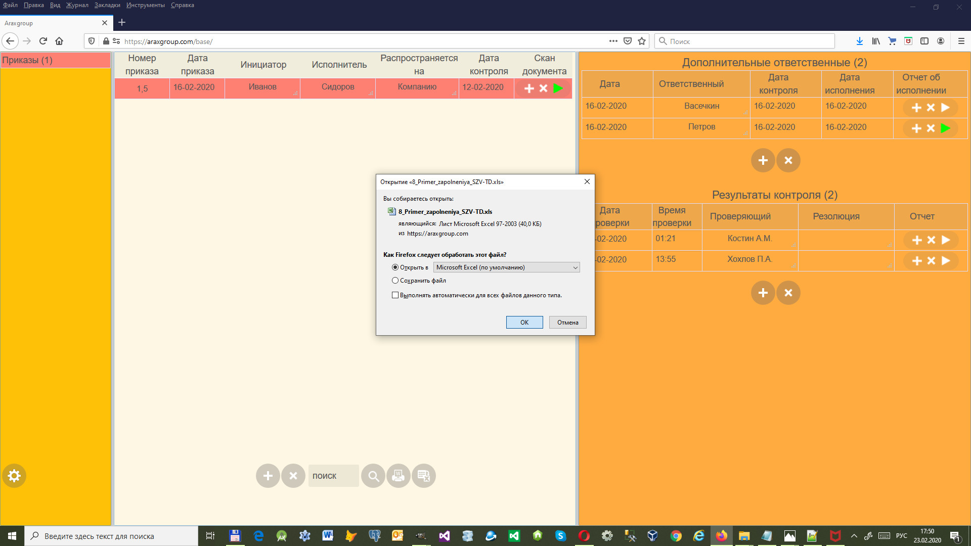 Будет предложено либо сохранить файл, либо открыть его в приложении, ассоциированном в Windows с типом прикрепленного файла.