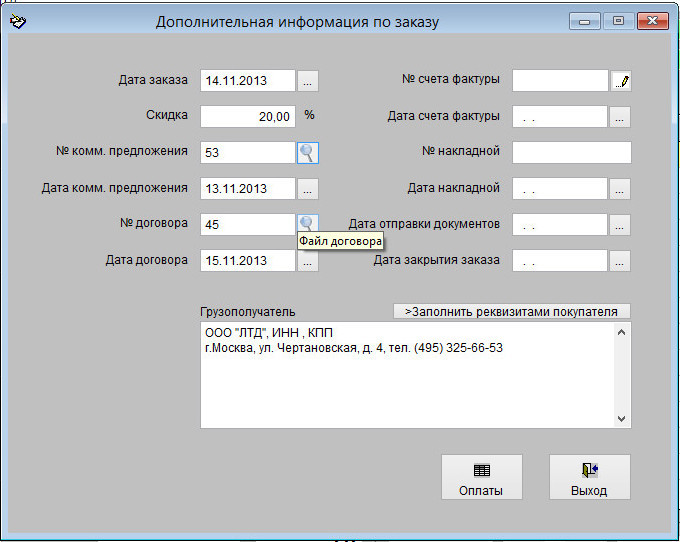 Для прикрепления договора в форме заказа нажмите кнопку "Дополнительная информация по заказу".