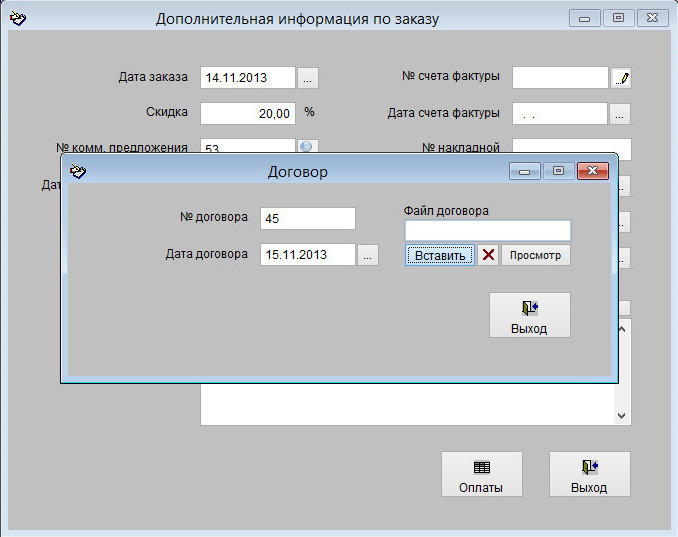 Для прикрепления файла договора нажмите кнопку "Вставить".