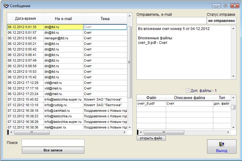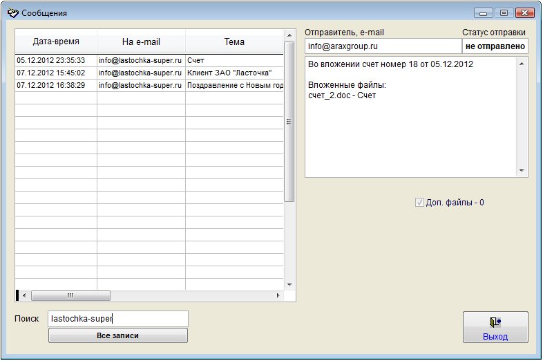 Для просмотра всех сообщений, отправленных из программы на конкретный e-mail выберите пункт меню "Сервис-Просмотр сообщений на e-mail".