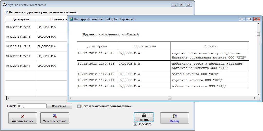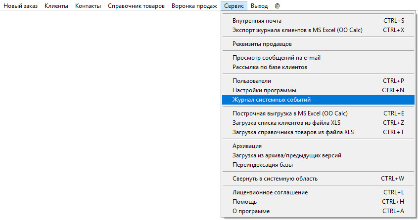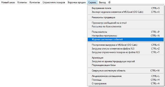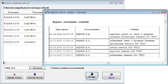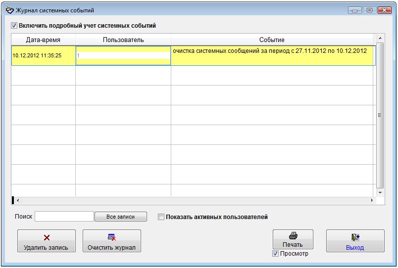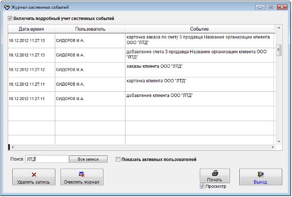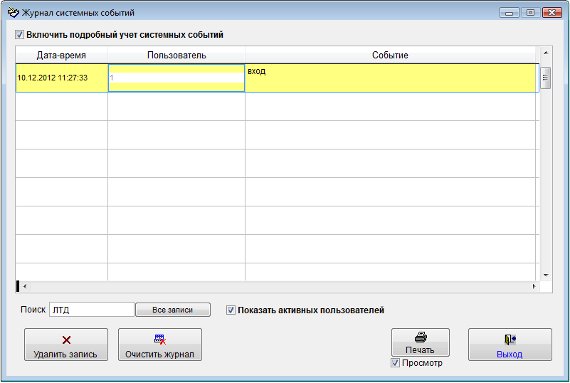 Для того, чтобы посмотреть историю работы пользователей в программе выберите пункт меню "Сервис-Журнал системных событий".