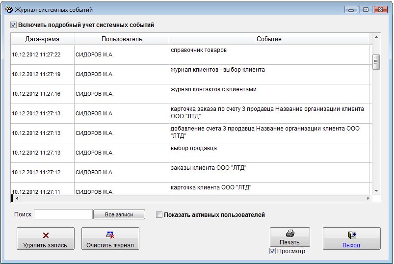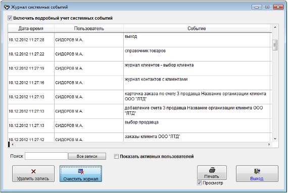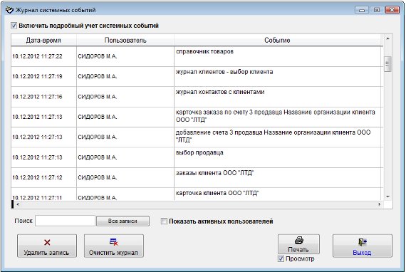 В данном журнале отображаются действия пользователей, работающих в программе (открытие разделов, добавление/удаление клиентов и контактов, отправка уведомлений)