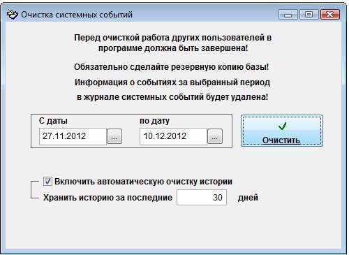 Откроется окно "Очистка системных событий".
