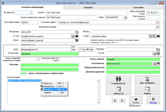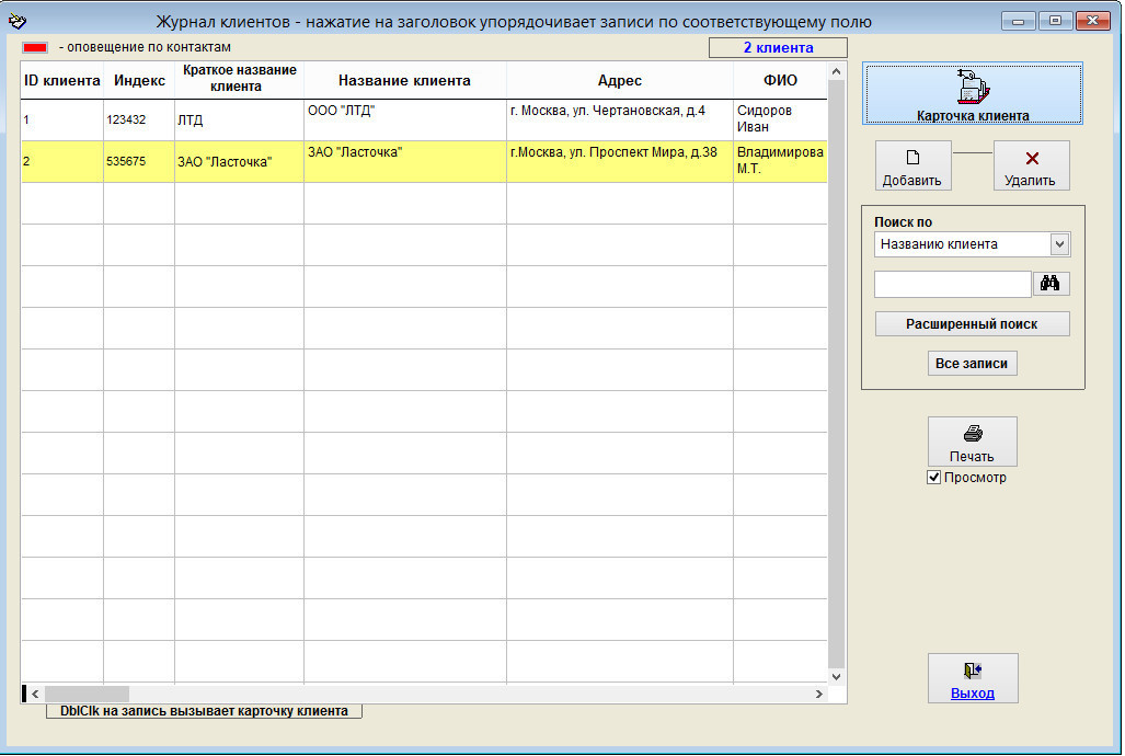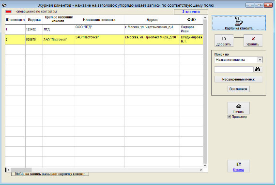 Для внесения изменений в в карточку внесенного ранее в журнал клиента установите курсор на нужного клиента.