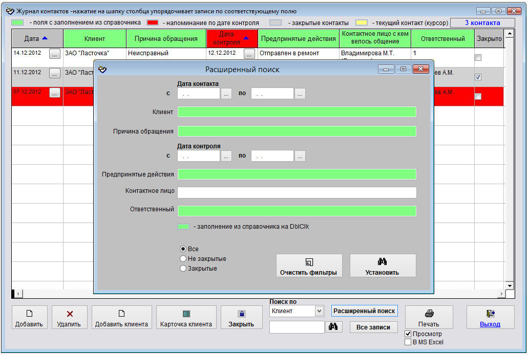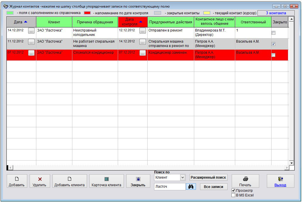 В журнале контактов отобразятся контакты, соответствующие условию поиска, т.е. контакты с клиентом "Ласточка".