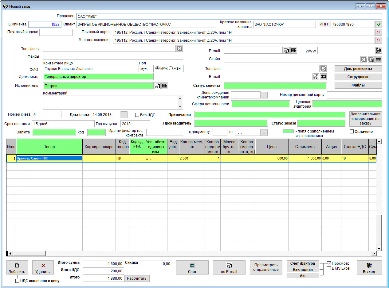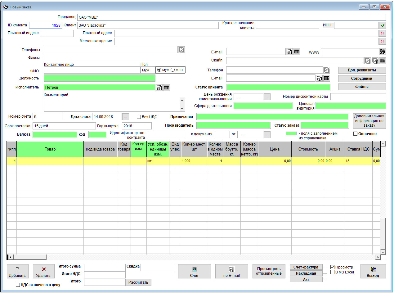 Если Вы захотите ввести нового клиента или если вводимый клиент не найден в базе, то откроется форма ввода заказа для нового клиента.