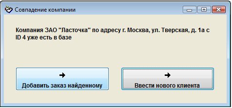 В случае, если добавляемый клиент уже есть в базу, после нажатия кнопки Ввод в окне "Ввод нового клиента" появится предупреждение, что клиент с таким названием уже есть в базе, и будет предложено либо добавить заказ найденному клиенту, либо добавить заказ для нового нового клиента.