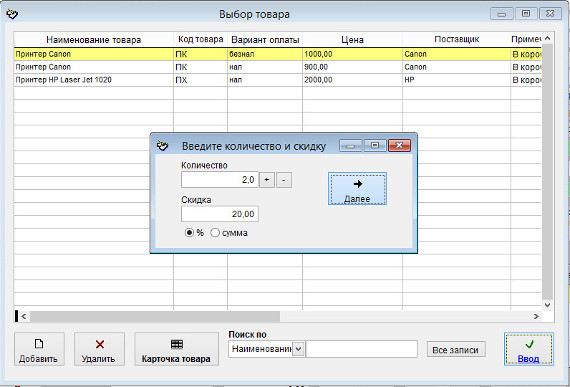 Вам будет предложено ввести количество скидку в рублях либо фиксированной суммой, по умолчанию будет предложена скидка для данного клиента из раздела Дополнительные реквизиты в карточке клиента.