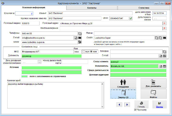 Внесите информацию о новом клиенте, заполните реквизиты клиента, при необходимости внесите сотрудников и прикрепите файлы.