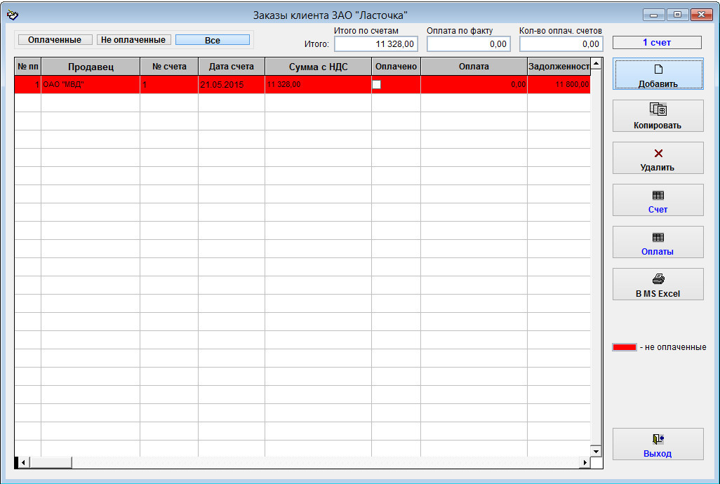 В бесплатной версии программы можно посмотреть заказы и оплаты только по каждому клиенту в его карточке, статистика формируется также только по счетам каждого клиента.