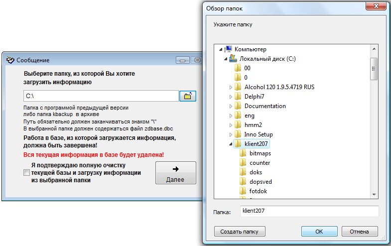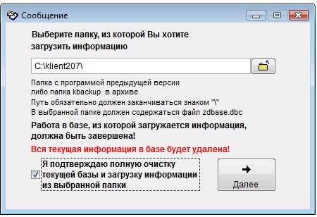 В открывшемся окне нажмите на кнопку с желтой папкой и выберите папку, из которой требуется загрузить информацию, например C:\klient207