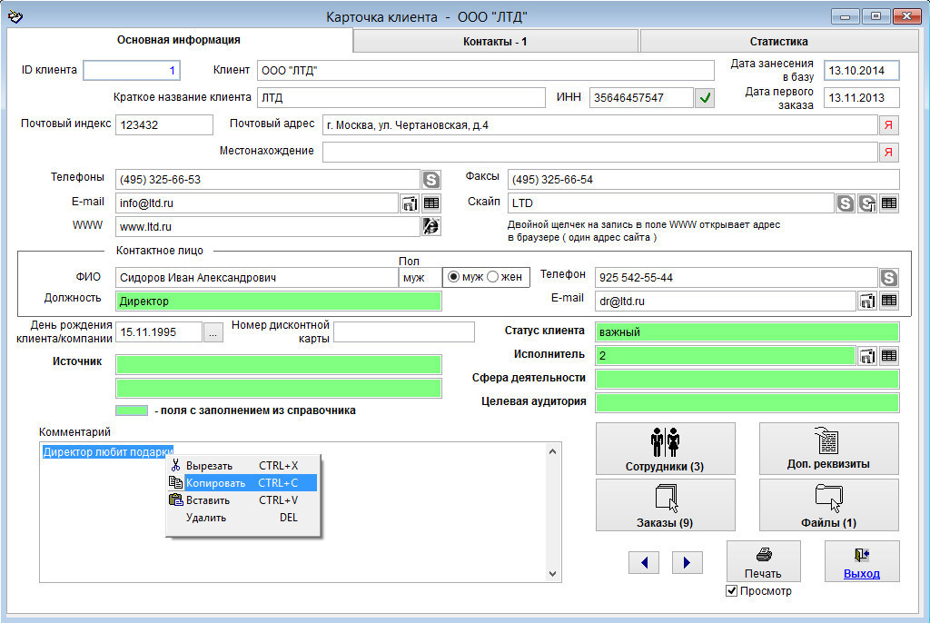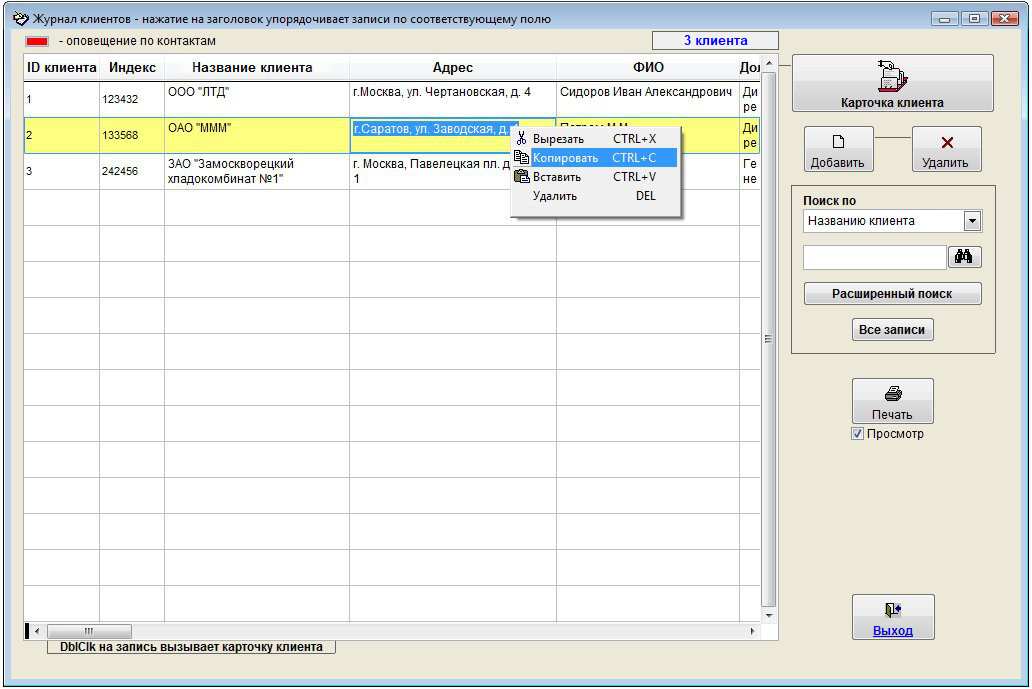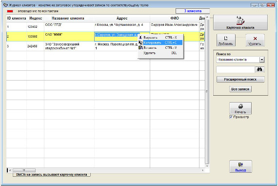 Аналогичным образом копирование/вставка осуществляется в любом разделе программы - карточке клиента, дополнительных журналах, справочниках.