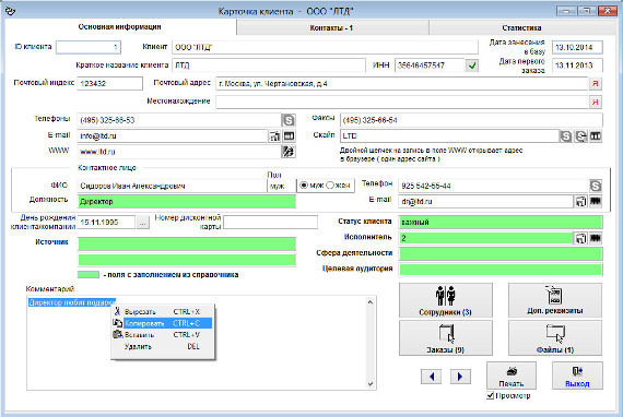 прикреплять к карточке клиента отсканированные копии документов, файлы, заносить сотрудников клиента, формировать счета и сразу отправлять их клиенту на e-mail,