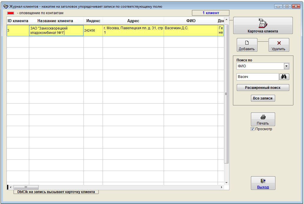 В журнале клиентов доступен поиск по следующим параметрам: