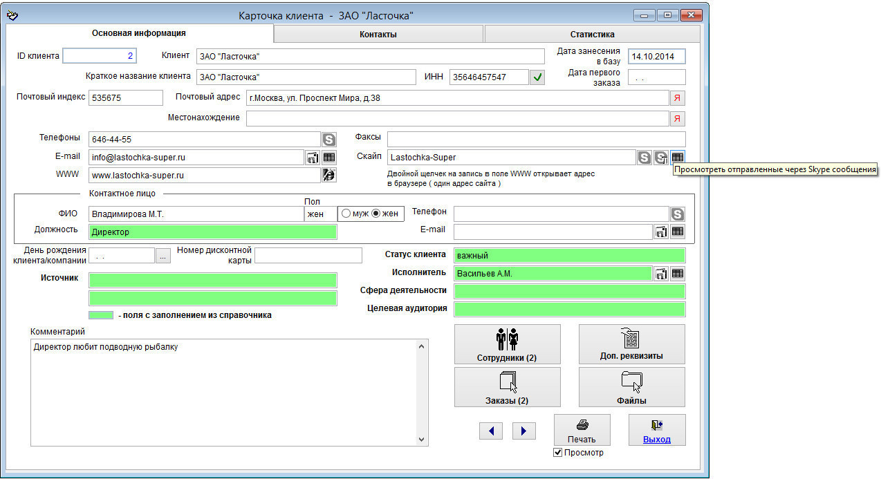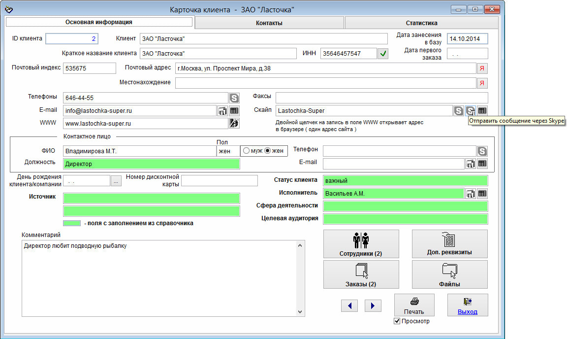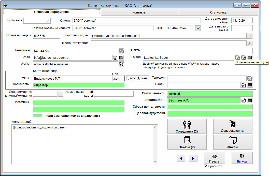Для звонка на номер клиента с использованием Skype надо открыть карточку клиента.