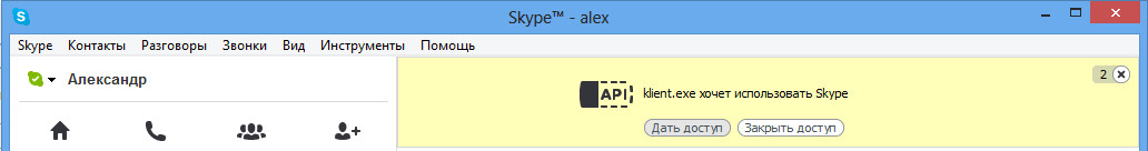 При первом обращении из программы Клиенты к скайпу после запуска, Skype выведет сообщение, что Klient.exe хочет использовать скайп.