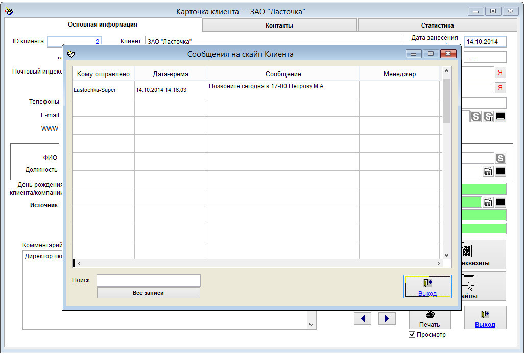 Откроются сообщения, отправленные из программы данному пользователю скайпа в связи с данным клиентом.